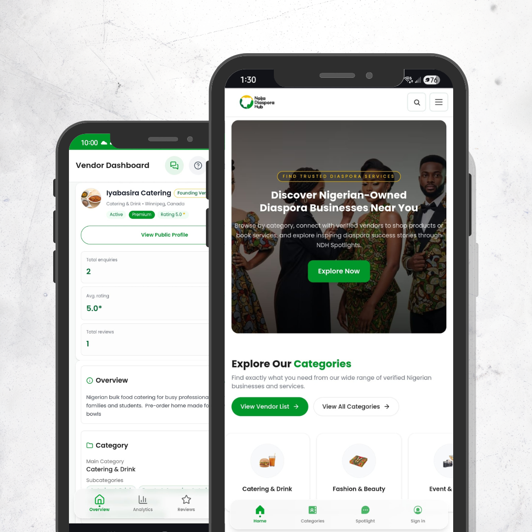 Naija Diaspora Hub is a trusted discovery platform where Nigerians in the diaspora can find, shop and book Nigerian-owned businesses across Canada, the US, and the UK.
